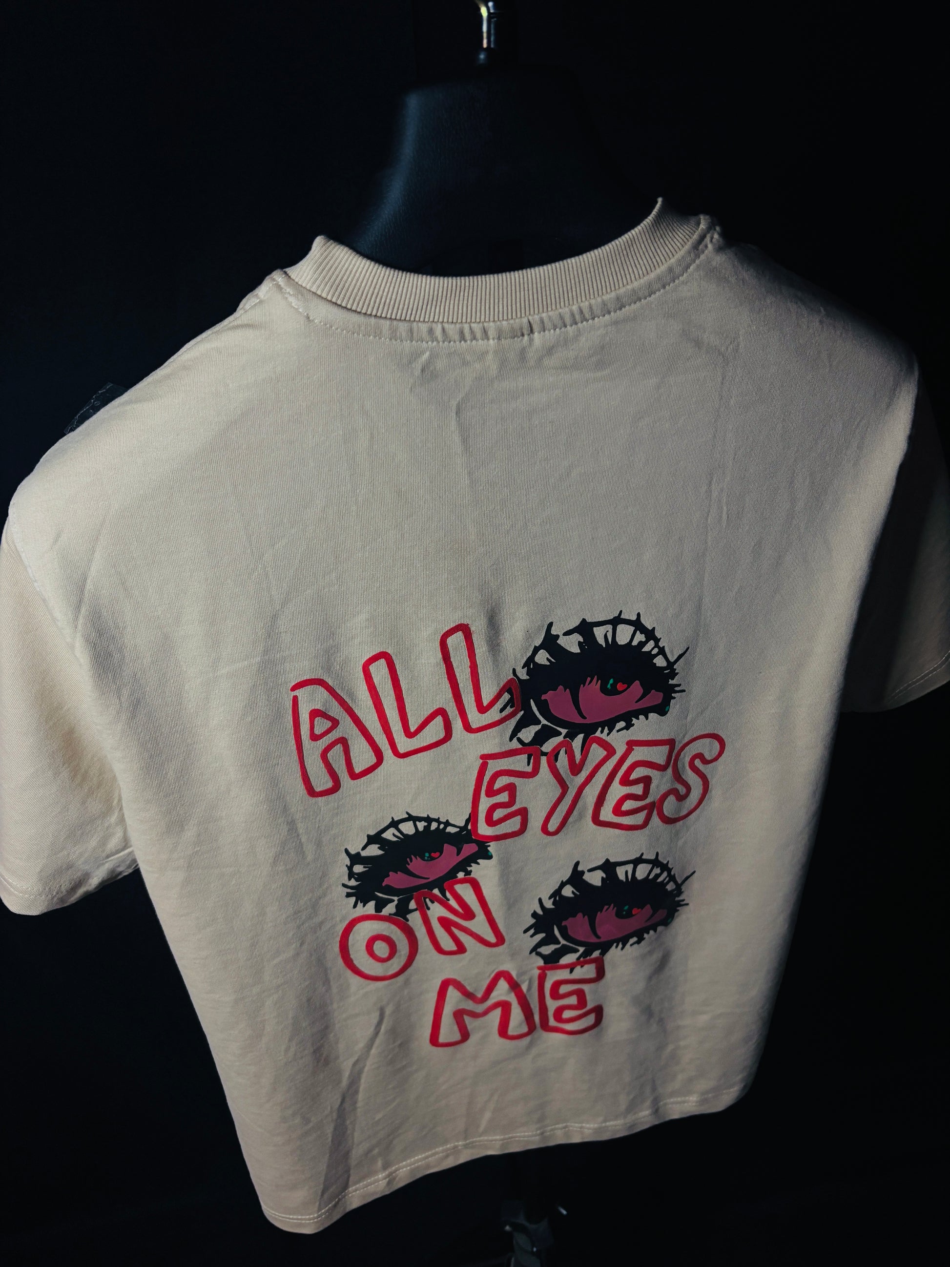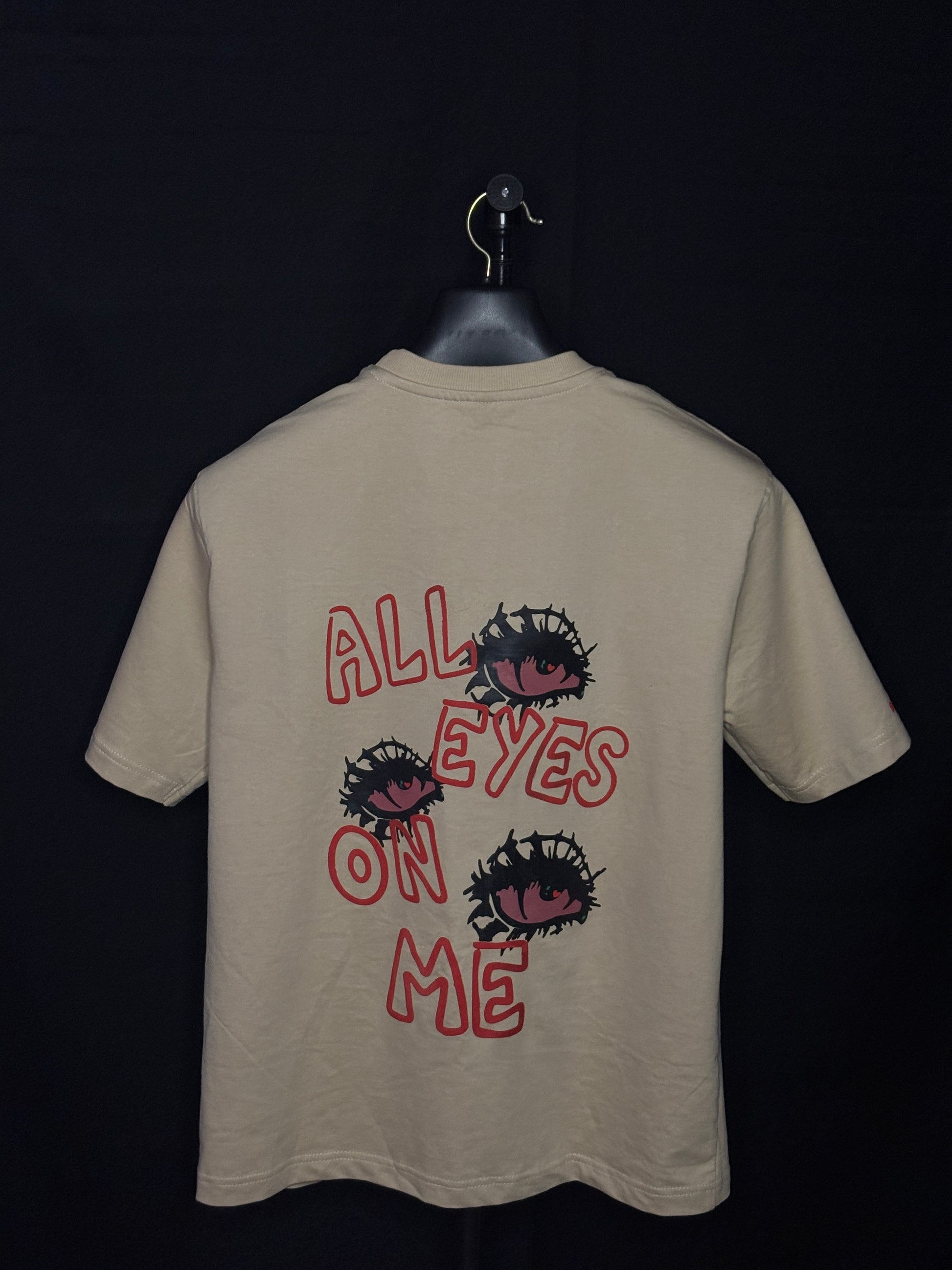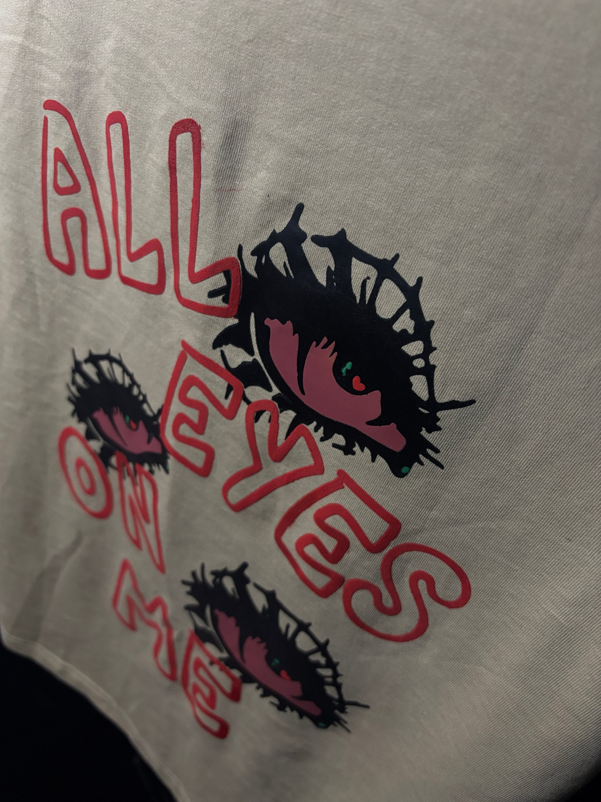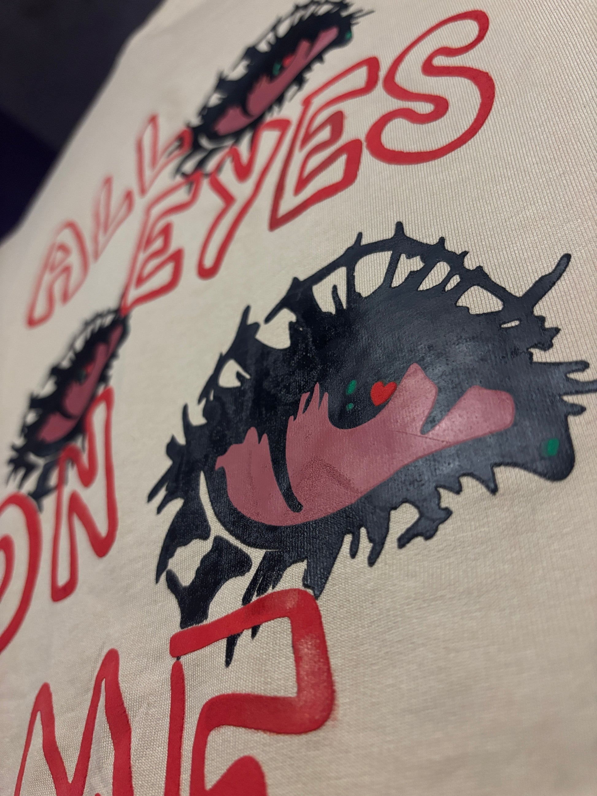 Beneath this visual intrusion, the text is scrawled like an urgent warning: "ALL EYES ON ME." It is not vanity; it is the acceptance of relentless observation.